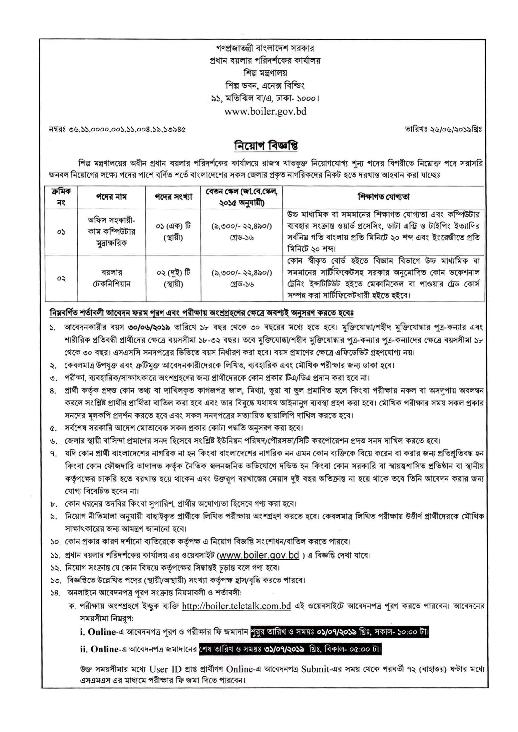 শিল্প মন্ত্রণালয়ের অধীন প্রধান বয়লার পরিদর্শকের কার্যালয় এ চাকুরীর বিজ্ঞপ্তি ২০১৯